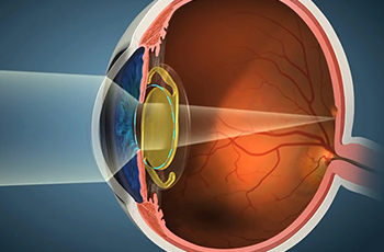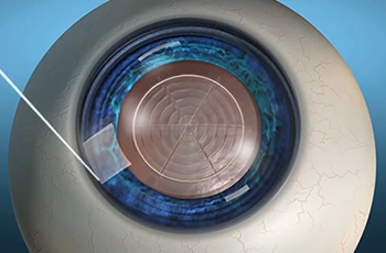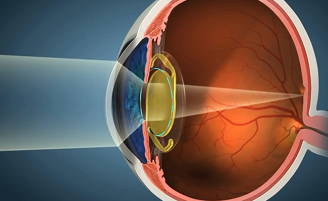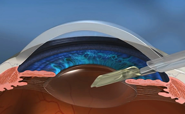 Bác sĩ đặt thủy tinh thể nội nhãn (IOL) qua vết mổ nhỏ.